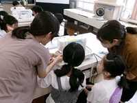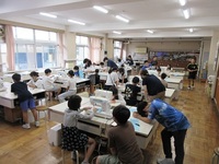 家庭科で初めてのミシンに挑戦しました。ミシンボランティアとして保護者の方にもお手伝い頂き、ボビンや下糸の入れ方など、ミシンの正しい使い方を学ぶことができました。