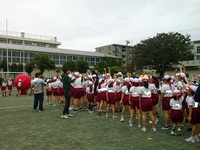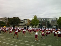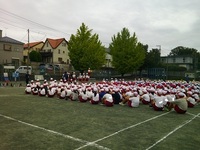 運動会に向けて、初めての全体練習を行いました。練習の最初には、計画委員から「心を一つに仲間と輝け最後まで」というスローガンが発表されました。その後、準備体操や整理体操のやり方を確認したり、大玉送りの練習をしたりして、運動会に向けてのやる気が高まりました。