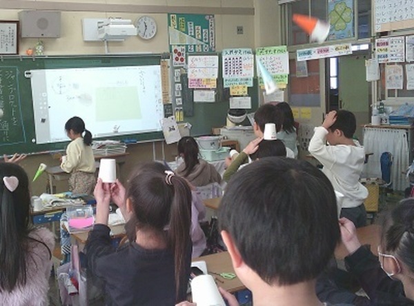 国語の教科書にある説明文「ジャンプロケットを作ろう」をしっかり読み取れたかどうかを確かめるために、みんなで教科書の通りに作ってみました。再度よく読む中で、作る人が分かりやすいように文章が工夫されていることに、改めて気付くことができました。作ったジャンプロケットをとばして楽しむこともできました。