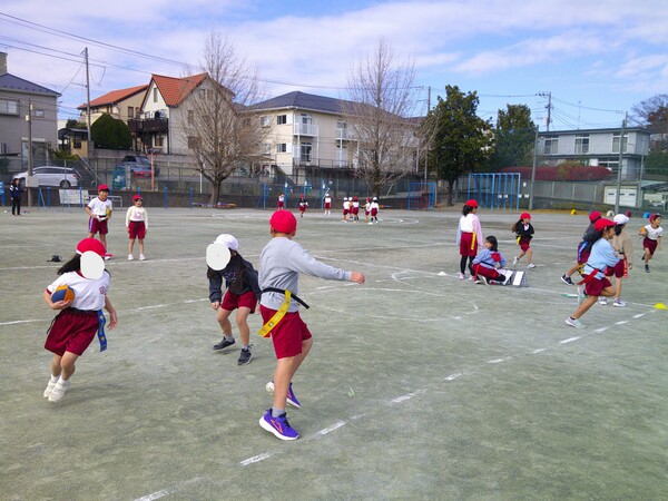 体育の授業でフラッグフットボールを行いました。子どもたちはチームで作戦を話し合い、パスや走るタイミングを工夫しながらプレーしました。この学習を通して、協力し合う楽しさと戦術の面白さを学ぶことができました。
