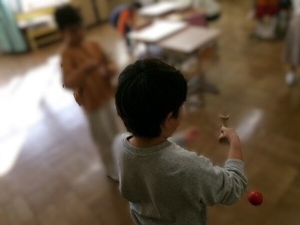こま回しや羽根つき、けん玉、お手玉など普段はあまり経験することのない遊びに、子どもたちは興味をもって取り組んでいました。
