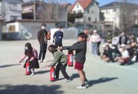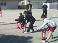 本日行われた避難訓練の後、4年生は、緑消防署署員の方に御指導いただきながら消火体験を行いました。全員が実際に消火器の操作を行えたわけではありませんが、みんなで「火事だ!」と声を出し、一緒に消火器の取り扱いを学びました。