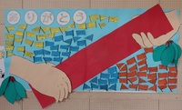 学校を支えてくれた6年生への感謝の気持ちとその役割を"繋ぐ"思いを伝えるために、画用紙で絵を描くコレオグラフィーを練習しております。