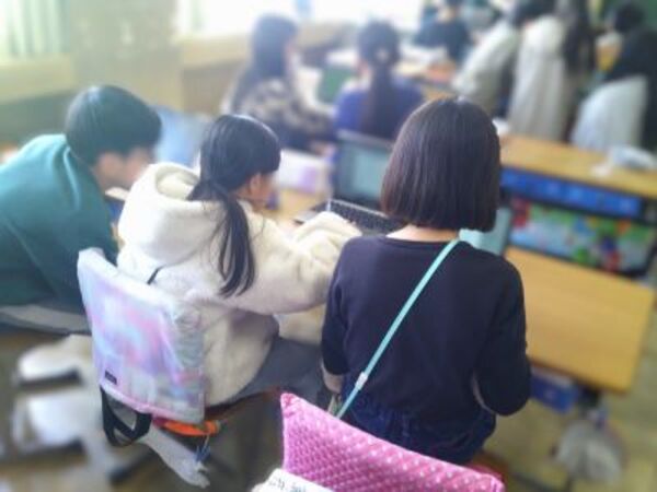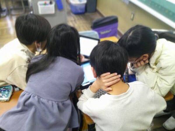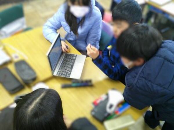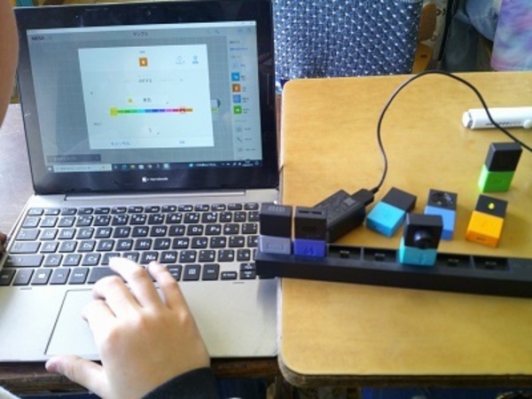 「MESH」という教材を用いて、プログラミング学習を行いました。総合や国語での学習内容をもとに考えた、誰もが暮らしやすくする「光で知らせるインターホン」などのアイデアを、センサーやライトなどを制御して再現しています。